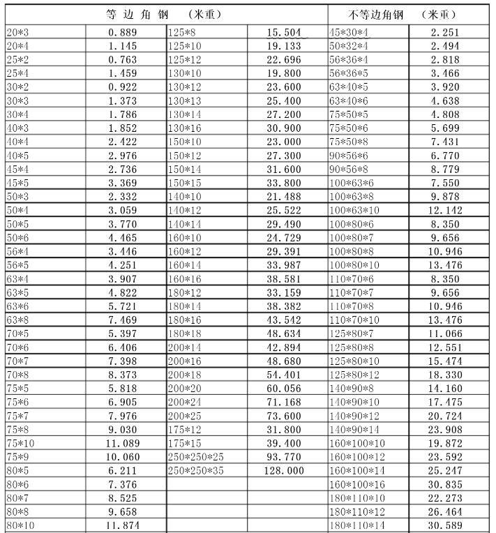 角钢理论重量表一览表
